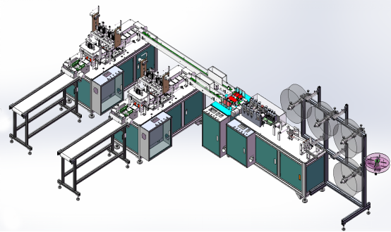高速全自動一拖二口罩機生產線,是為生產平面口罩而定制的全自動化生產線,從原材料入料到成品完成均為一條線自動化作業,包括自動送料、鼻線插入、折緊、超聲波熔接、切皮、焊線等全程自動化。設備產量高、操作方便、省工省時,良率高。
